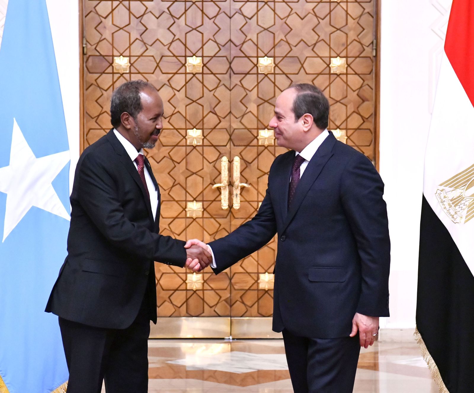 من جانبه؛ أعرب الرئيس الصومالي عن خالص تقديره لحفاوة الاستقبال، مؤكدًا الحرص على تطوير التعاون مع مصر على مختلف المستويات في إطار مرحلة إعادة بناء المؤسسات الوطنية الصومالية، وذلك في ظل ما يجمع البلدين الشقيقين من علاقات تاريخية، والمكانة المتميزة التي تتمتع بها مصر في وجدان الشعب الصومالي، أخذًا في الاعتبار دور مصر التاريخي في مساندة الصومال وما تقدمه من دعم في مختلف المجالات، خاصةً في المجال التعليمي، ونشر ثقافة الإسلام الوسطي والفكر المعتدل، وكذا تنمية الكوادر البشرية الصومالية، بالإضافة إلى الثقل المحوري لمصر على صعيد صون السلم والأمن في المنطقتين العربية والأفريقية.