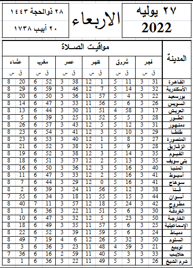 مواقيت الصلاة اليوم وفقًا للتوقيت المحلي لمدينتي القاهرة والإسكندرية وعدد من مدن ومحافظات الجمهورية من واقع بيانات الهيئة العامة للمساحة: