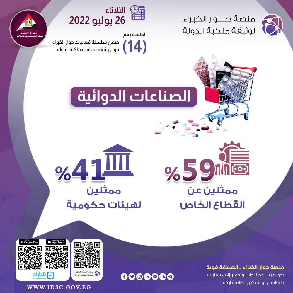 يستكمل مركز المعلومات ودعم اتخاذ القرار بمجلس الوزراء، اليوم الثلاثاء، عقد ورش العمل في إطار سلسلة جلسات "حوار الخبراء" لمناقشة مستهدفات وثيقة "سياسة ملكية الدولة" بقطاع الصناعات الدوائية.