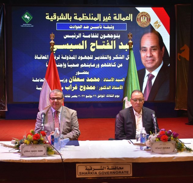 جاء ذلك خلال حضور وزير القوى العاملة لمحافظة الشرقية، لتسليم 20 وثيقة تأمين تكافلي ضد الحوادث الشخصية للعمالة غير المنتظمة والمُسجلة بقاعدة بيانات مديرية القوي العاملة ضمن 250 وثيقة مقدمة للمديرية وذلك في احتفالية نظمتها مديرية القوي العاملة بقصر ثقافة الزقازيق.