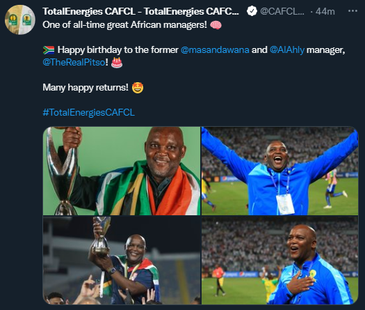احتفل الاتحاد الأفريقي لكرة القدم "كاف" عبر حسابه الرسمي على موقع التغريدات الشهير "تويتر" بعيد ميلاد المدير الفني الجنوب أفريقي بيتسو موسيماني والذي يوافق اليوم الثلاثاء 26 يوليو الجاري.