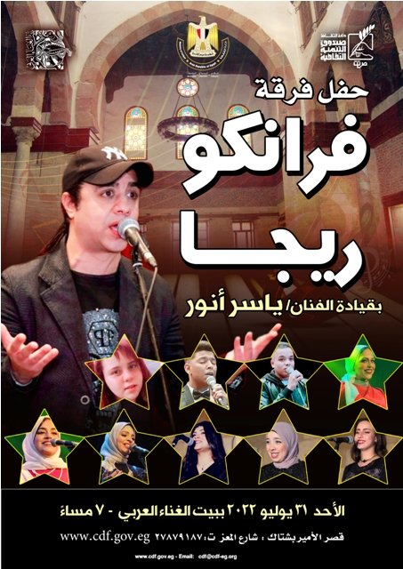 يقيم بيت الغناء العربي بقصر الأمير بشتاك بشارع المعز، والتابع لقطاع صندوق التنمية الثقافية، في تمام السابعة من مساء الأحد المقبل الموافق 31 يوليو الجاري حفل فني لفرقة فرانكو ريجا.