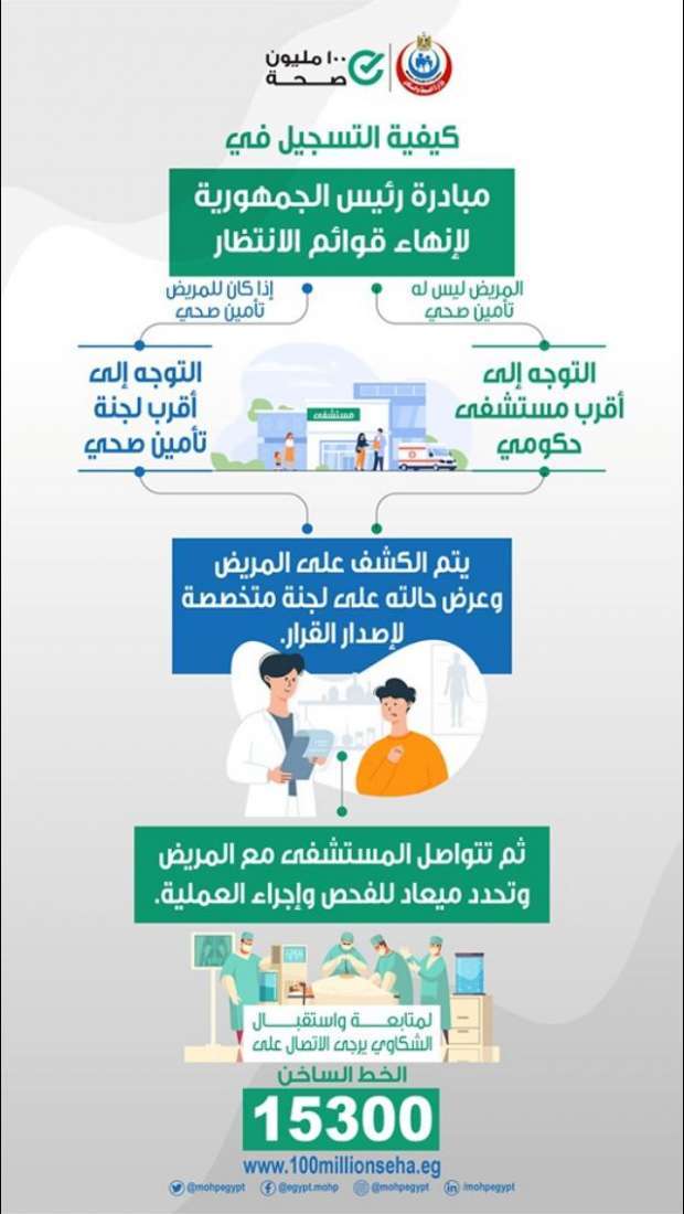 وعن آلية الحصول على الخدمة الطبية، أوضحت وزارة الصحة أنه إذا كان المريض ليس له تأمين صحي يتوجه إلى أقرب مستشفي حكومي وإذا كان لديه تأمين صحي يتوجه إلى أقرب لجنة تأمين صحي ويتم الكشف عليه وعرض حالته على لجنة متخصصة لإصدار القرار، ثم تتواصل المستشفى مع المريض وتحدد ميعاد للفحص وإجراء العملية.