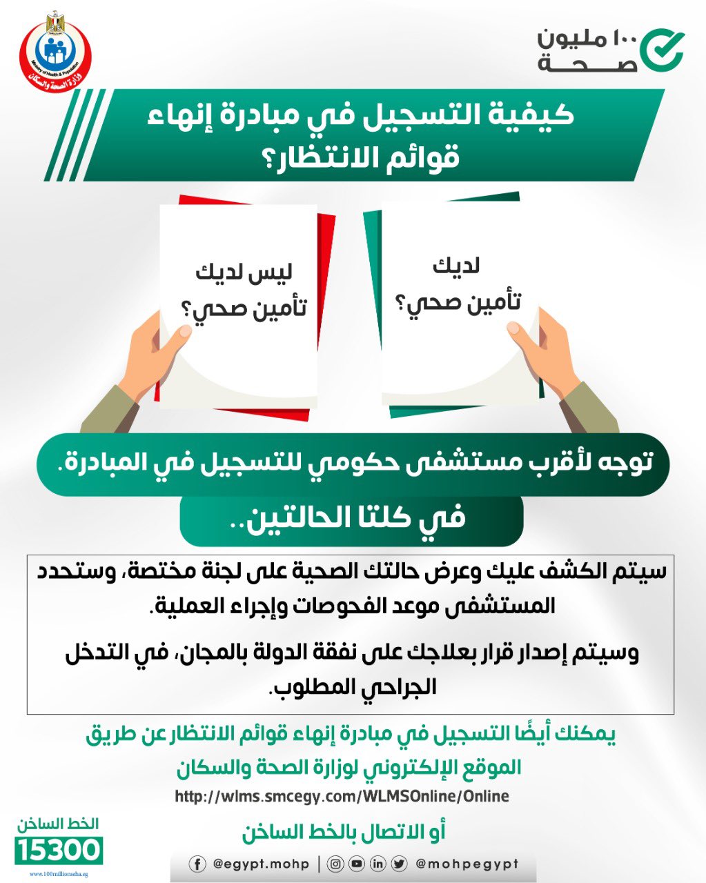 وناشدت وزارة الصحة والسكان المواطنين ممن يحتاجون لتدخلات جراحية من العمليات التي تشملها المبادرة، بالتسجيل على الموقع الإلكتروني المخصص لمتابعة حالات مبادرة القضاء على قوائم الانتظار