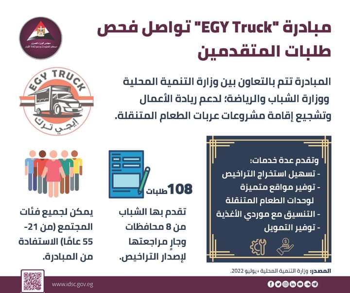 قال مركز المعلومات ودعم اتخاذ القرار بمجلس الوزراء إنه تم إطلاق مبادرة "إيجي ترك" في إطار التعاون المشترك بين وزارة التنمية المحلية ووزارة الشباب والرياضة لدعم ريادة الأعمال وتشجيع إقامة مشروعات عربات الطعام المتنقلة لتوفير فرص عمل للشباب.