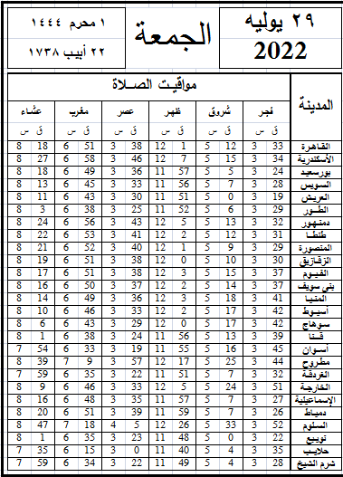 مواقيت الصلاة اليوم وفقًا للتوقيت المحلي لمدينتي القاهرة والإسكندرية وعدد من مدن ومحافظات الجمهورية من واقع بيانات الهيئة العامة للمساحة:
