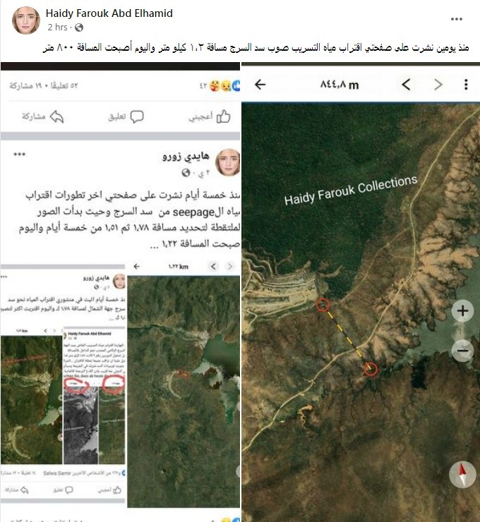 وكتب هايدي فاروق تدوينة على الفيس بوك منذ ما يقرب من أسبوع "اثبت في منشوري اقتراب المياه نحو سد السرج جهة الشمال لمسافة ١،٧٨ ك واليوم اقتربت اكثر لتصبح ١،٥١ ك...".
