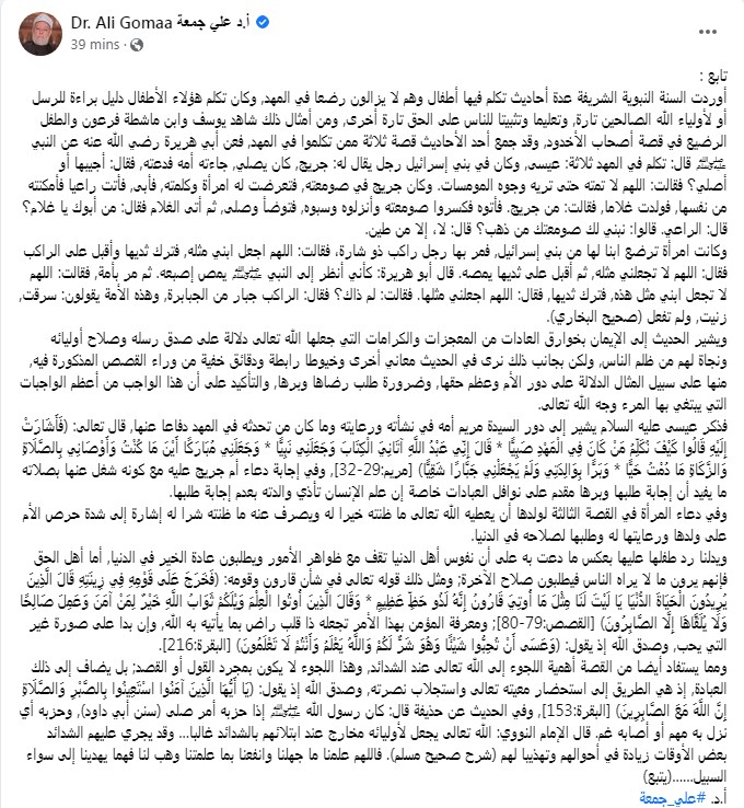 وكتب علي جمعة تدوينة على الفيس بوك "أوردت السنة النبوية الشريفة عدة أحاديث تكلم فيها أطفال وهم لا يزالون رضعا في المهد، وكان تكلم هؤلاء الأطفال دليل براءة للرسل أو لأولياء الله الصالحين تارة، وتعليما وتثبيتا للناس على الحق تارة أخرى، ومن أمثال ذلك شاهد يوسف وابن ماشطة فرعون والطفل الرضيع في قصة أصحاب الأخدود"
