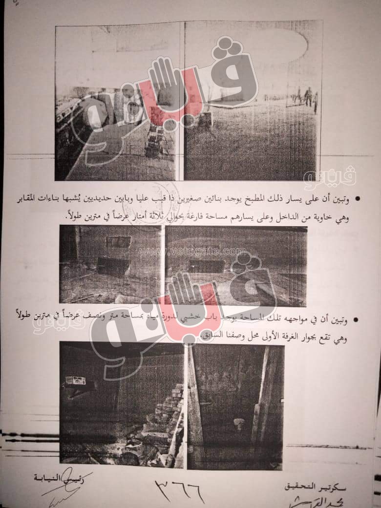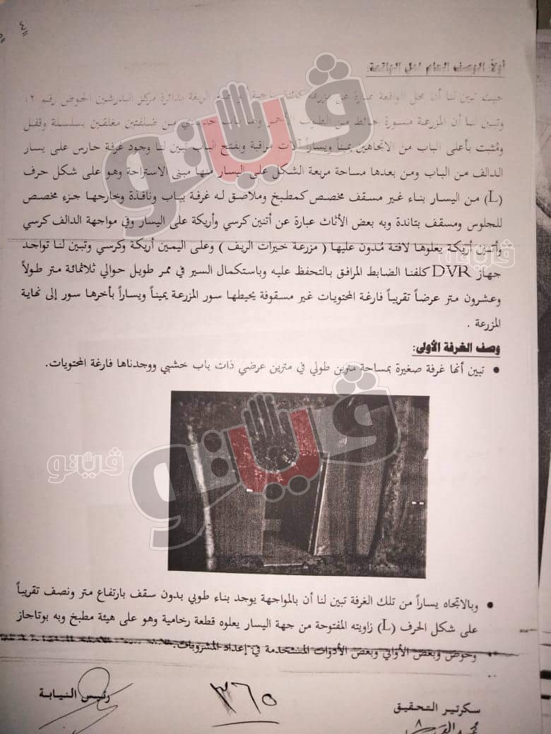 وأشارت المعاينة إلى أن الغرفة المجاورة لمكان دفن جثة المذيعة شيماء جمال غير مستوية من الجهة اليسرى كغرفة ٥ أمتار في ٥ أمتار وبها بعض النباتات العشبية وبعض المنقولات والمساحة التي بالمنتصف مسطح حوالي ١٠ أمتار عرضا و٥ أمتار طولا تقريبا بالمواجهة وبها كمية كبيرة من علف حيواني "تبن" وأرشد المتهم الثاني عن مكان لحد المجني عليها شيماء جمال بالجهة اليسرى من ذلك المكان.