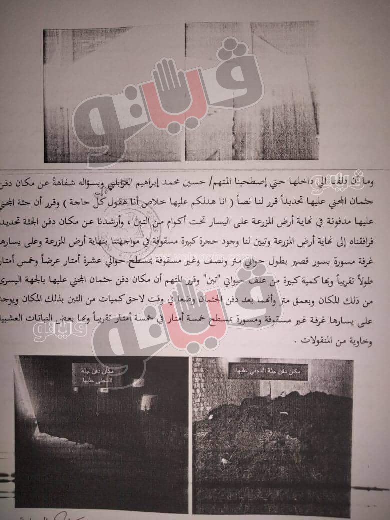 وكشفت المعاينة التصويرية انه باصطحاب المتهم الثاني حسين الغرابلي وبالدلوف إلى داخل المزرعة وبسؤاله شفاهة عن مكان دفن جثمان المجني عليها قال نصا: "أنا هدلكم عليها خلاص أنا هقول كل حاجة" وقرر أن جثة المجني عليها مدفونة في نهاية أرض المزرعة على اليسار تحت أكوام من التبن.