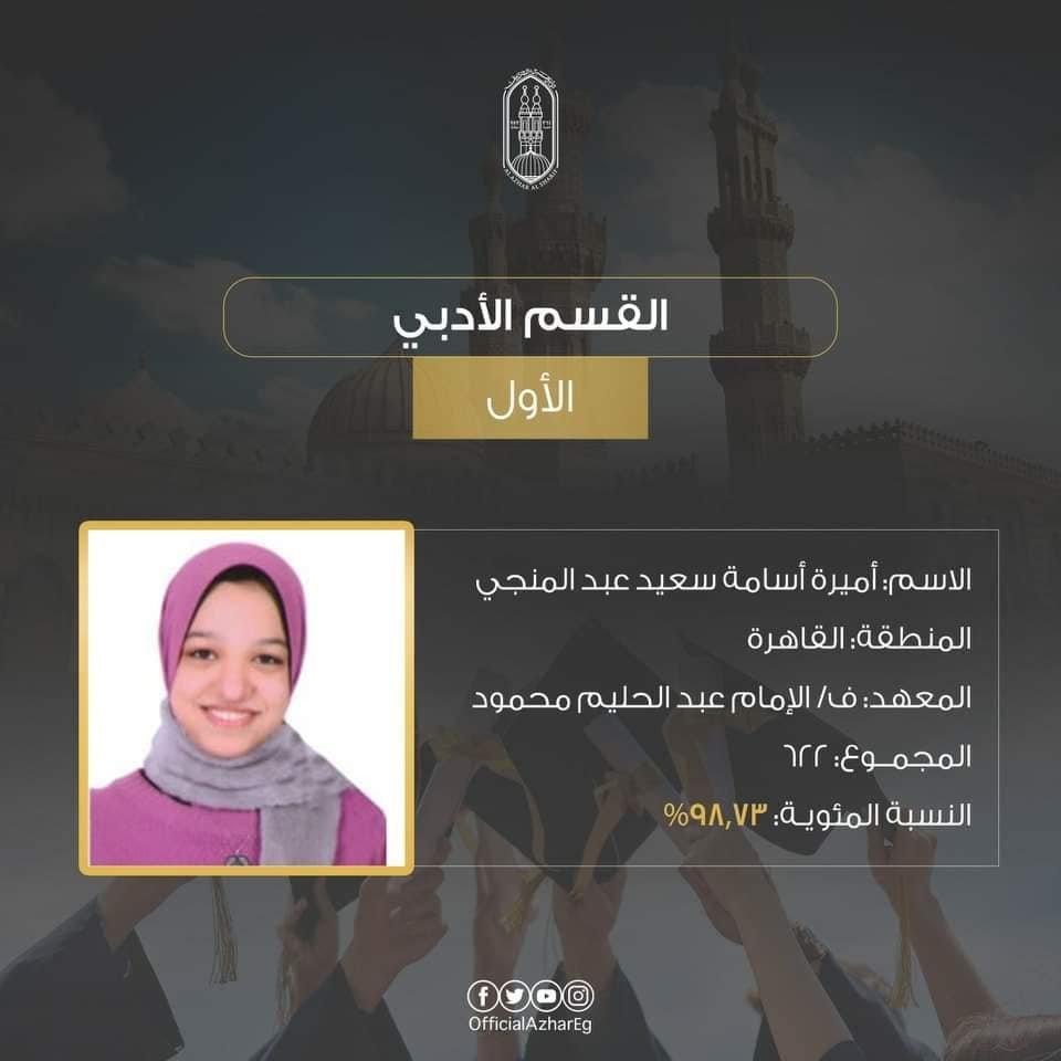 حصلت أميرة أسامة سعيد عبد المنجي، الطالبة بمعهد فتيات الإمام عبد الحليم محمود بمنطقة القاهرة الأزهرية، على المركز الأول على القسم الأدبي بمجموع (٦٢٢) درجة بنسبة (٩٨.٧٣٪).