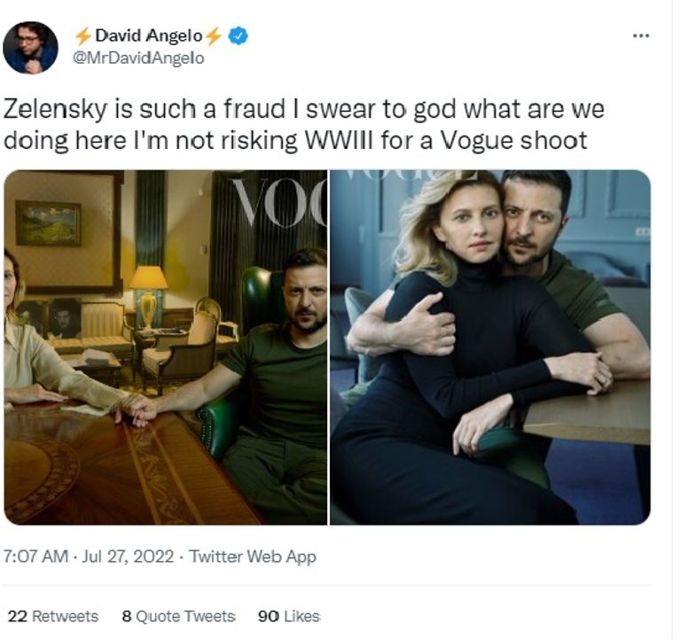 من جهته، قال الكاتب الأمريكى الشهير ديفيد أنجيلو على تويتر «زيلينسكى محتال... لا أخاطر بالحرب العالمية الثالثة من أجل تصوير فوج».