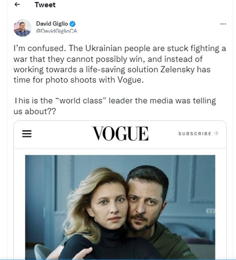 وعلق الزعيم الجمهورى من ولاية كاليفورنيا ديفيد جيجليو: «أنا محتار. الشعب الأوكرانى عالق فى خوض حرب لا يمكن أن يفوز بها، وبدلًا من العمل من أجل حل منقذ للحياة،وزيلينسكى لديه الوقت لالتقاط الصور مع فوج. هذا هو الزعيم العالمى الذى كان الإعلام يخبرنا عنه؟».