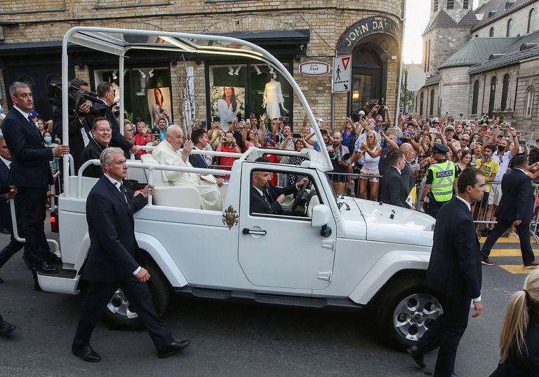 واجتمع الكنديون في شوارع المدينة لمشاهدة البابا البالغ من العمر 85 عامًا وهو يغادر قلعة كيبيك في المدينة بعد يومين قضاهما في مقاطعة ألبرتا الغربية.