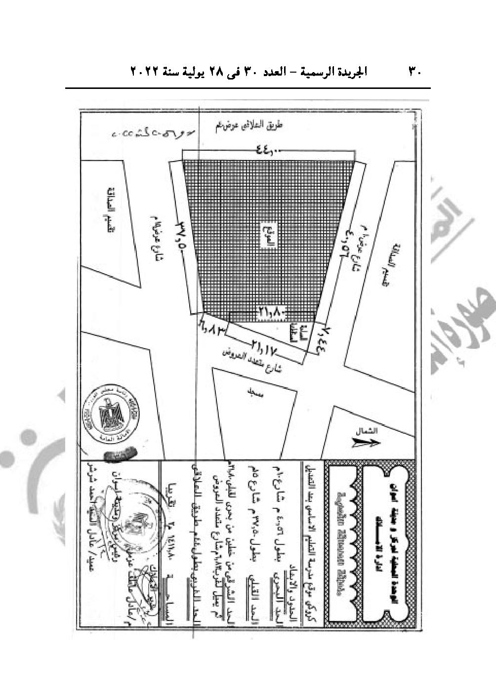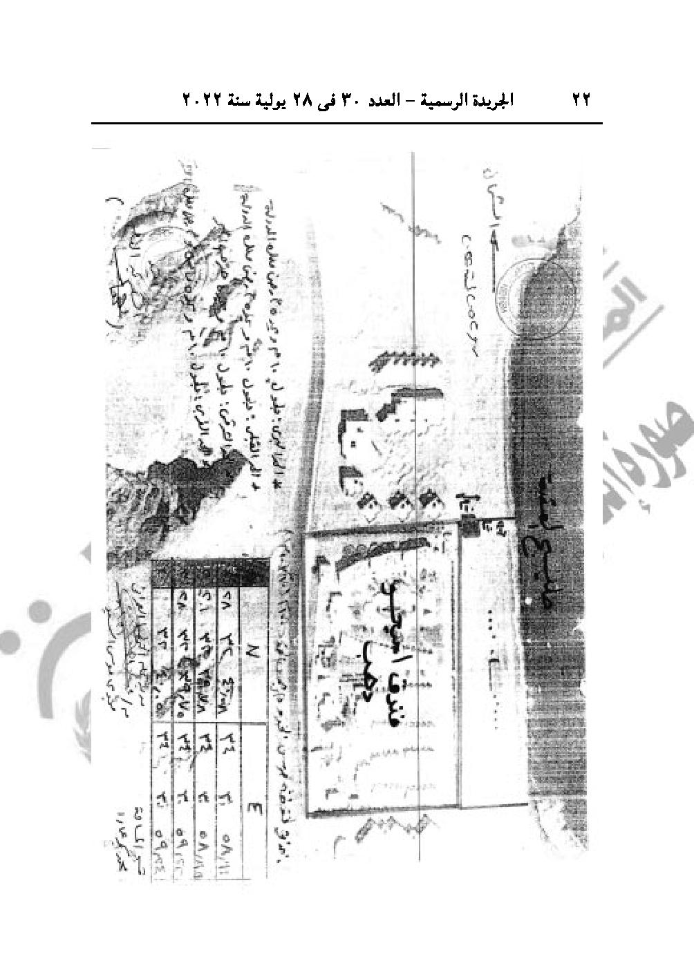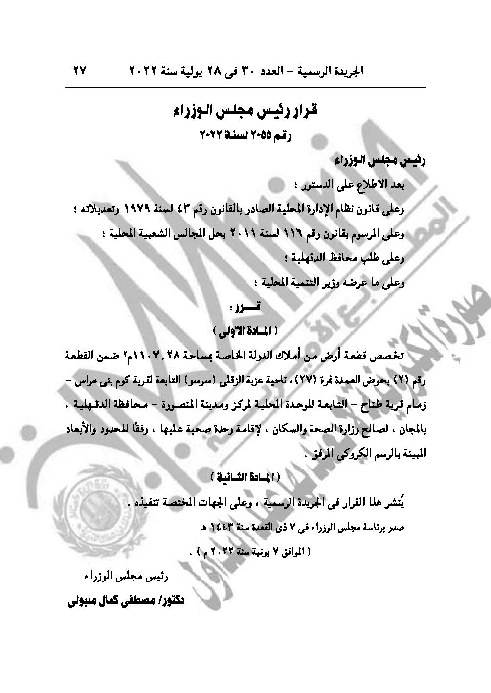 وقرار مجلس الوزراء رقم 2055 لسنة 2022، بشأن تخصص قطعة أرض من أملاك الدولة الخاصة بمساحة 1107.28م2 ضمن القطعة رقم (2) بحوض العمدة نمرة (27)، ناحية عزبة الزقلي (سرسو) التابعة لقرية كوم بني مراس- زمام قرية طناح- التابعة للوحدة المحلية لمركز ومدينة المنصورة- محافظة الدقهلية، بالمجان، لصالح وزارة الصحة والسكان، لاقامة وحدة صحية عليها، وفقا للحدود والأبعاد المبينة بالرسم الكروكي المرفق.