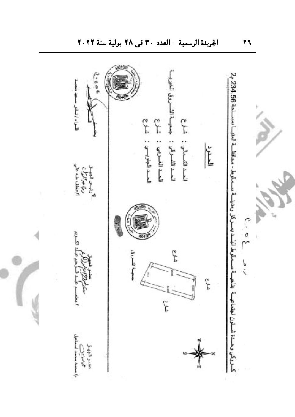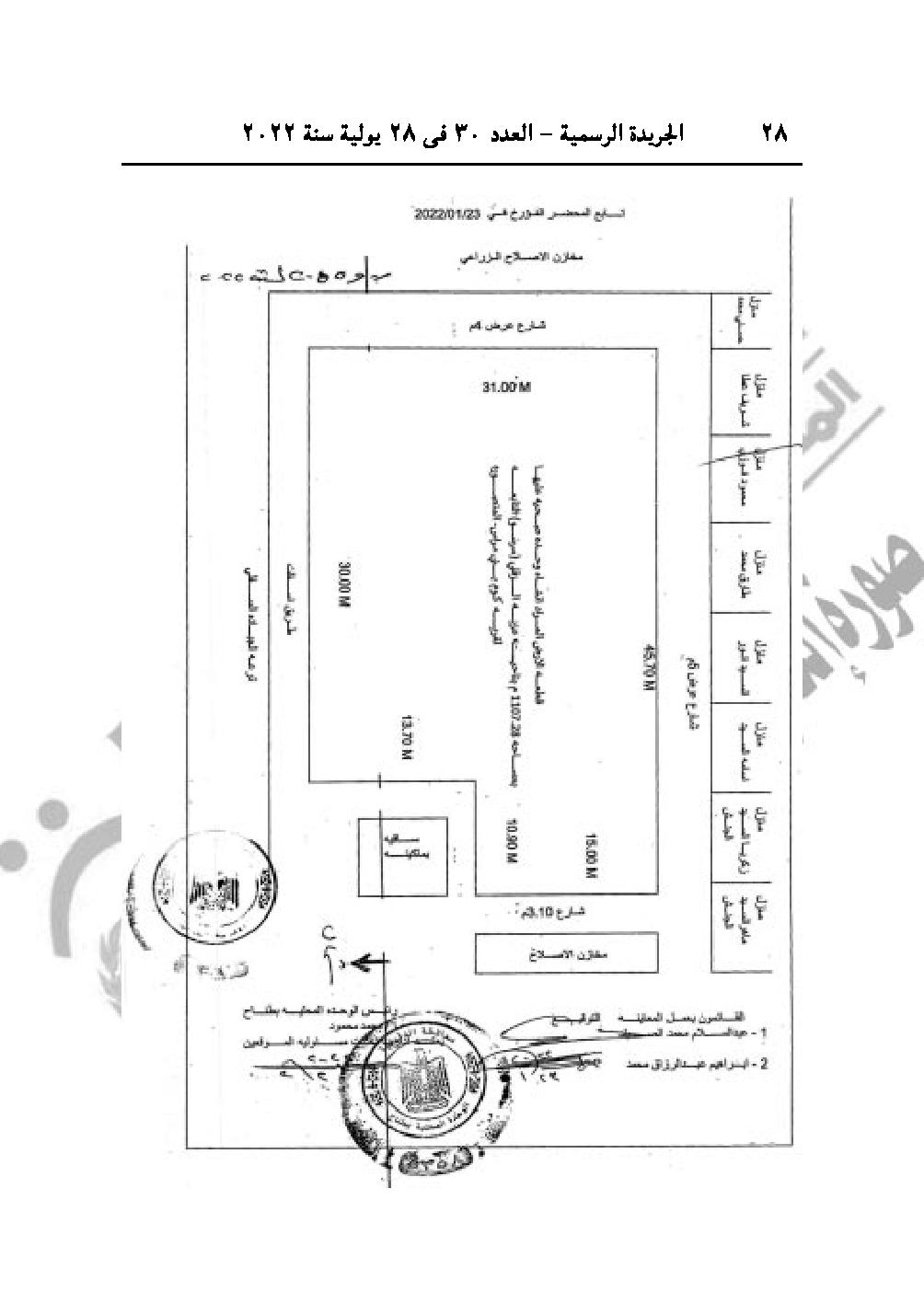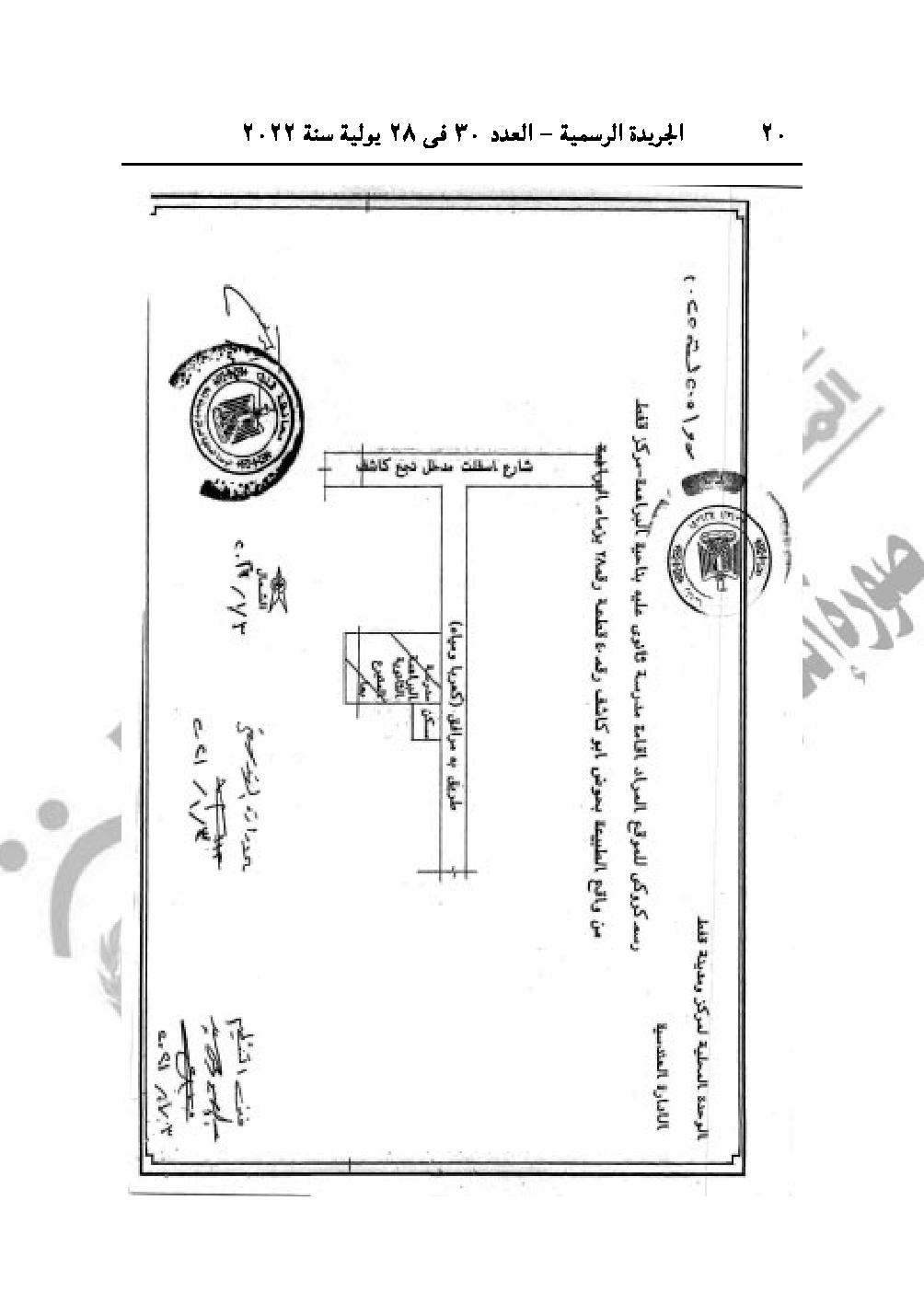وقرار مجلس الوزراء رقم 2055 لسنة 2022، بشأن تخصص قطعة أرض من أملاك الدولة الخاصة بمساحة 1107.28م2 ضمن القطعة رقم (2) بحوض العمدة نمرة (27)، ناحية عزبة الزقلي (سرسو) التابعة لقرية كوم بني مراس- زمام قرية طناح- التابعة للوحدة المحلية لمركز ومدينة المنصورة- محافظة الدقهلية، بالمجان، لصالح وزارة الصحة والسكان، لاقامة وحدة صحية عليها، وفقا للحدود والأبعاد المبينة بالرسم الكروكي المرفق.