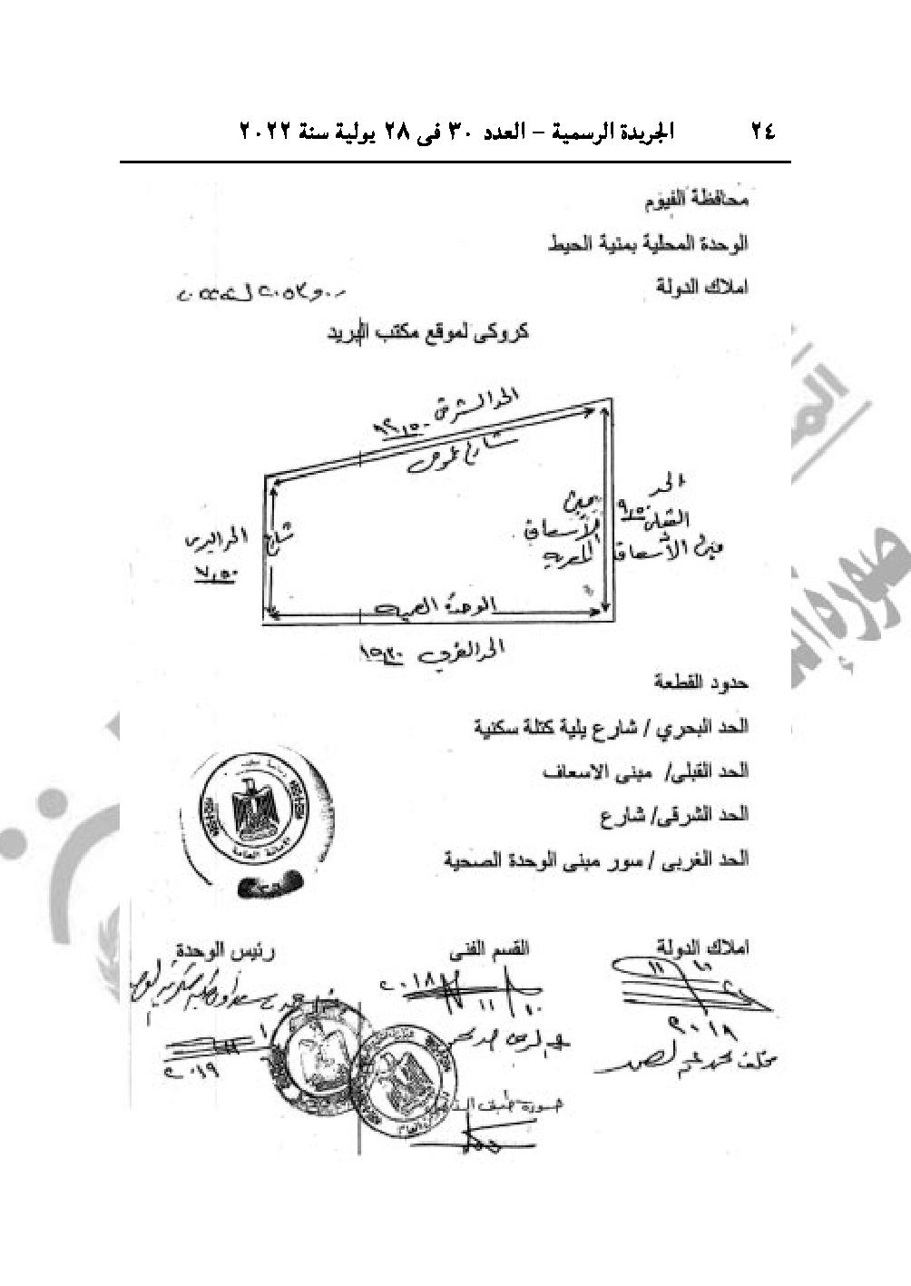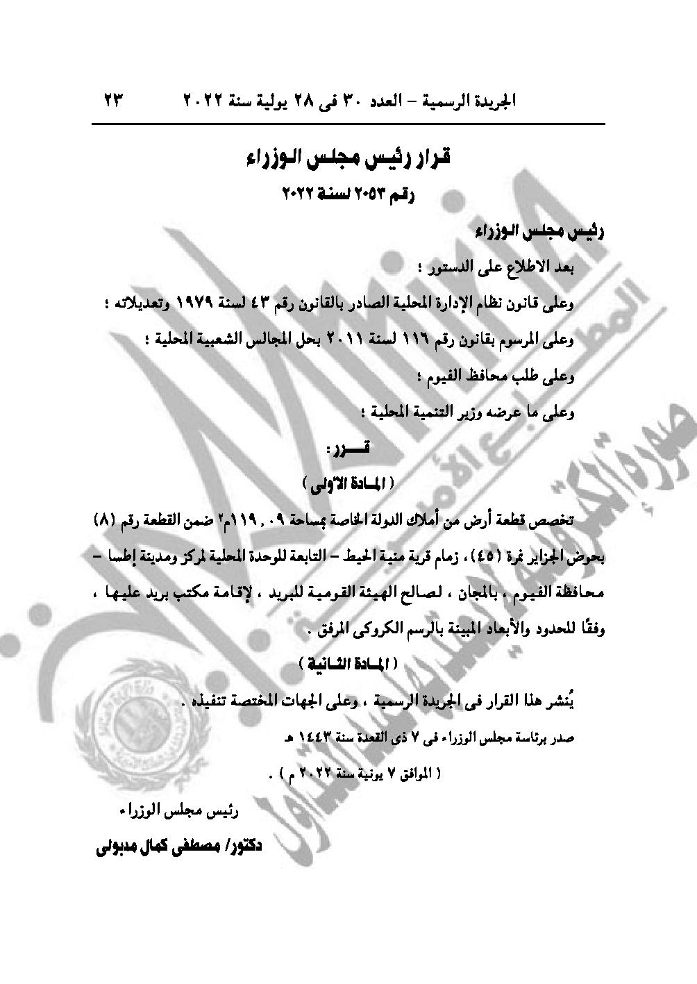 قرار مجلس الوزراء رقم 2053 لسنة 2022، بشأن تخصص قطعة أرض من أملاك الدولة الخاصة بمساحة 119.09م2 ضمن القطعة رقم (8) بحوض الجزاير نمرة (45)، زمام قرية منية الحيط- التابعة للوحدة المحلية لمركز ومدينة اطسا- محافظة الفيوم، بالمجان، لصـالح الهيئة القومية للبريد، لاقامة مكتب بريد عليها، وفقا للحدود والأبعاد المبينة بالرسم الكروكي المرفق.