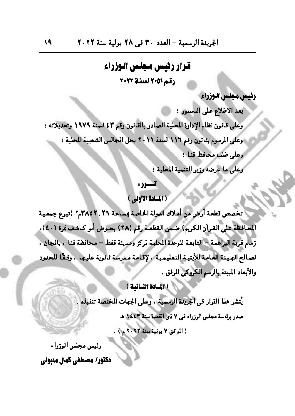 وقرار مجلس الوزراء رقم 2051 لسنة 2022، بشأن تخصص قطعة أرض من أملاك الدولة الخاصة بمساحة 3852.26م2 (تبرع جمعية المحافظة علي القرآن الكريم) ضمن القطعـة رقم (28) بحـوض أبو كاشف نمرة (40)، زمام قرية البراهمة - التابعة للوحدة المحلية لمركز ومدينة قفط- محافظة قنا، بالمجان، لصالح الهيئة العامة للأبنية التعليمية، لاقامة مدرسة ثانوية عليها، وفقا للحدود والأبعاد المبينة بالرسم الكروكي المرفق.