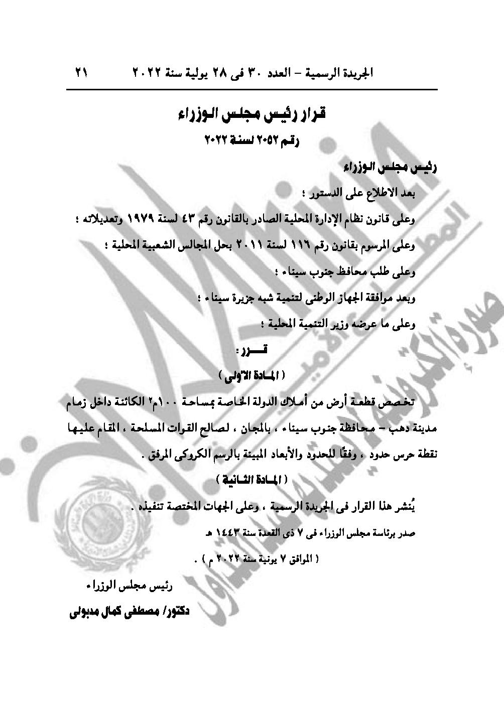 وقرار مجلس الوزراء رقم 2052 لسنة 2022، بشأن تخصص قطعة أرض من أملاك الدولة الخاصة بمساحة 100م2 الكائنة داخل زمام مدينة دهب- محافظة جنوب سيناء، بالمجان، لصالح القوات المسلحة، المقام عليها نقطة حرس حدود، وفقا للحدود والأبعاد المبينة بالرسم الكروكي المرفق.