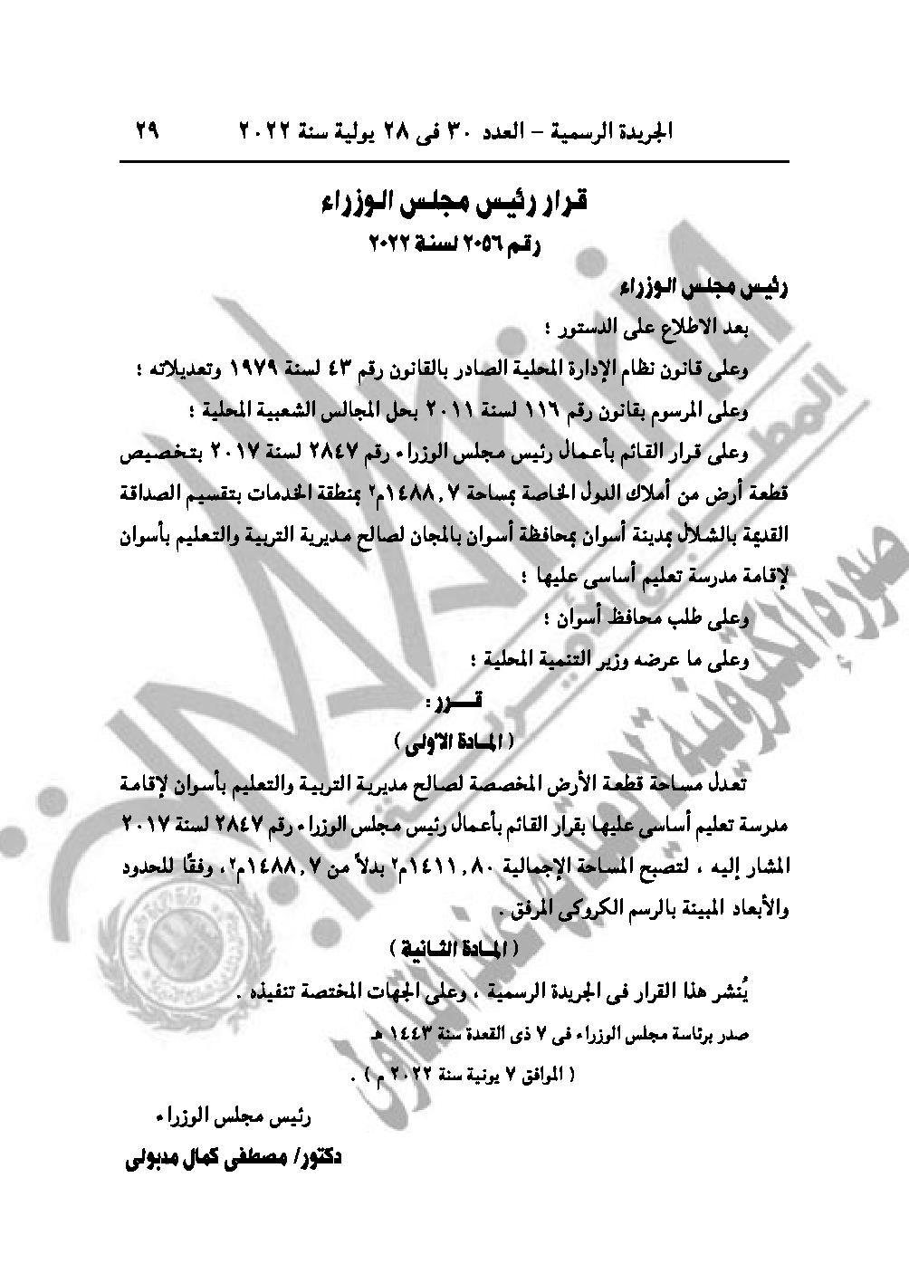 قرار مجلس الوزراء رقم 2056 لسنة 2022، بشأن تعدل مساحة قطعة الأرض المخصصة لصالح مديرية التربية والتعليم بأسوان لاقامة مدرسة تعليم أساسي عليها بقرار القائم بأعمال رئيس مجلس الوزراء رقم 2847 لسنة 2017 المشار اليه، لتصبح المساحة الاجمالية 1411.80م2 بدلا من 1488.7م2، وفقا للحدود والأبعاد المبينة بالرسم الكروكي المرفق.