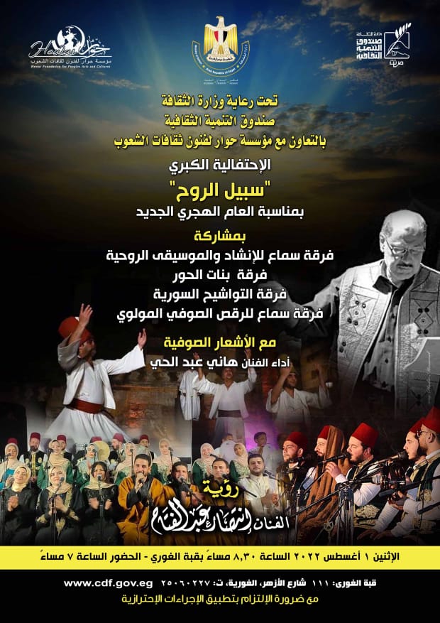 يقيم قطاع صندوق التنمية الثقافية برئاسة الدكتور فتحى عبد الوهاب وبالتعاون مع مؤسسة حوار لفنون ثقافات الشعوب برئاسة الفنان المبدع انتصار عبد الفتاح احتفالية دولية كبري تحت عنوان "سبيل الروح" بمناسبة العام الهجرى الجديد.