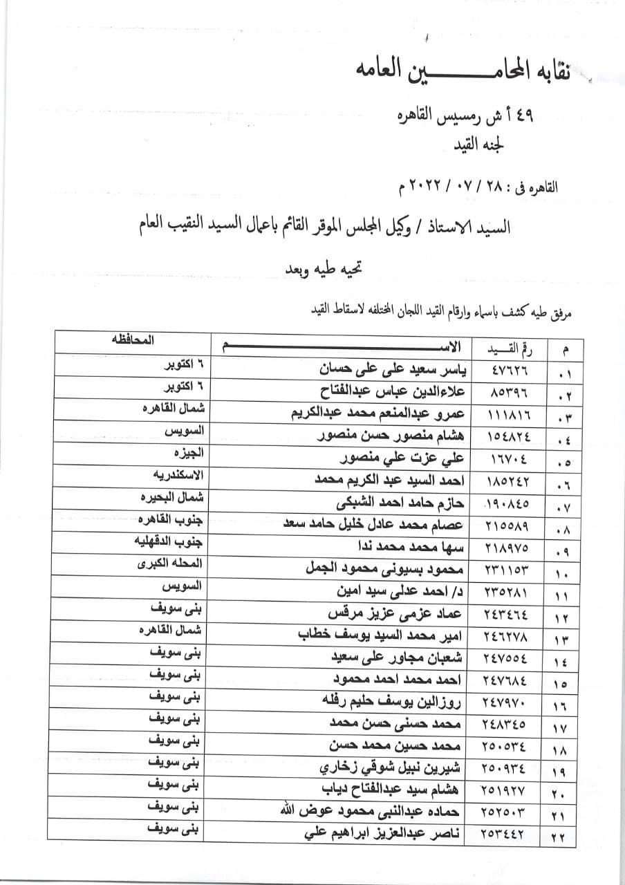 أخطرت لجنة القيد بالنقابة العامة للمحامين، مجدي سخى، القائم بأعمال نقيب المحامين، بأنه تنفيذًا لأحكام قانون المحاماة المادة (12)،وبناء على البحث في مخالفات التأمينات عن قطاعي التأمين «قطاع الأعمال العام والخاص» و«القطاع الحكومي»، أسقط القيد عن ١٥٠محاميًا، حيث وضحت نتيجة الفحص في برينت التأمينات الخاصة بكل منهم عملهم بعمل غير مهنة المحاماة.