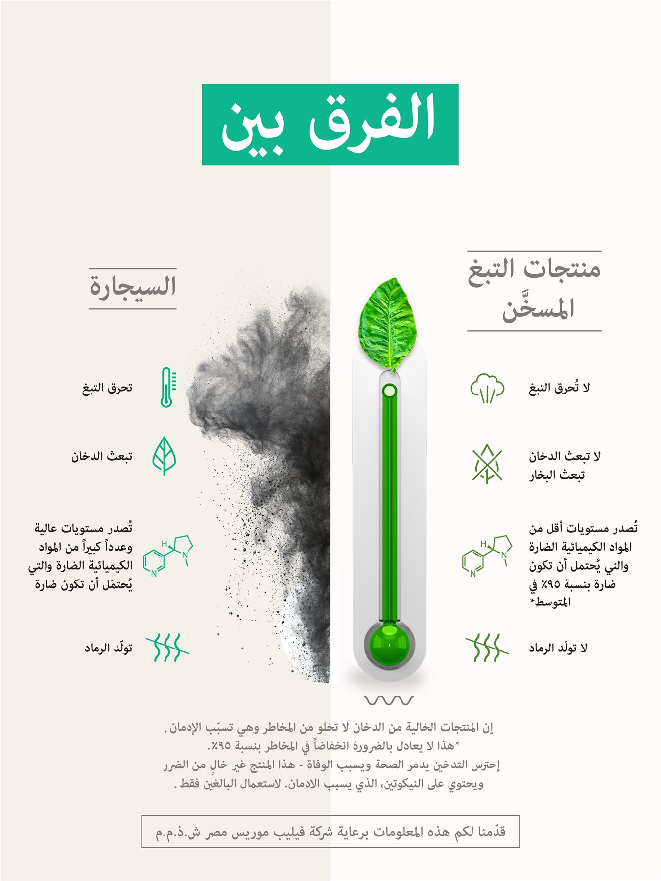 وبالاستناد إلى الحقائق العلمية فإن النيكوتين - وهو مركب عضوي يوجد في الطبيعة وليس فقط في أجزاء نبات التبغ- لا يعد سببًا رئيسًا للأمراض المرتبطة بالتدخين بالرغم من أنه قد يؤدي للإدمان، بل إن أضرار التدخين سببها الرئيسي آلاف المواد الكيميائية الضارة الناتجة عن عملية إشعال السيجارة - والتي تبدأ عند درجة 600 مئوية - وحرق مكوناتها، لذلك فإن إقصاء عملية الحرق واستبدالها بمنتجات تعمل على تسخين التبغ تُنتج مستويات أقل من المواد الكيميائية الضارة مقارنة بالسجائر التقليدية.