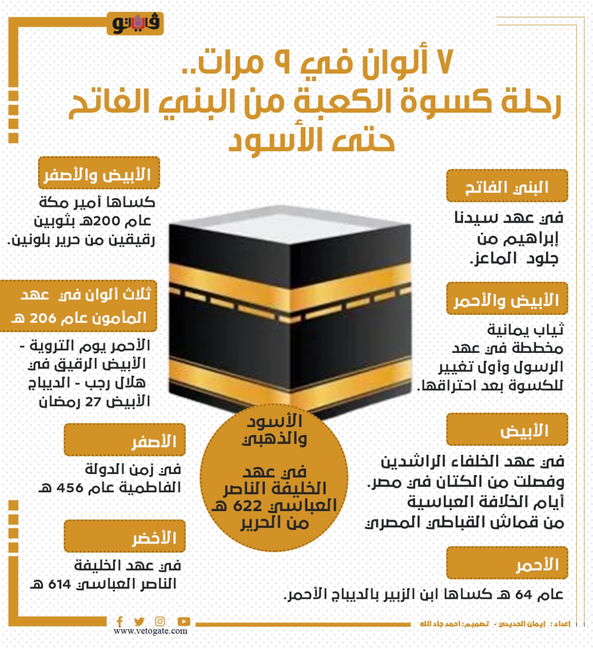 7 ألوان في 9 مرات.. رحلة كسوة الكعبة من البني الفاتح حتى الأسود | إنفوجراف السبت 30/يوليو/2022 - 06:01 م 7/30/2022 6:01:26 PM كسوة الكعبة إيمان الحديدى شارك طباعة 18 حجم الخط شارك طباعة الخلفاء الراشدون الدولة الفاطمية كسوة الكعبة الكعبة