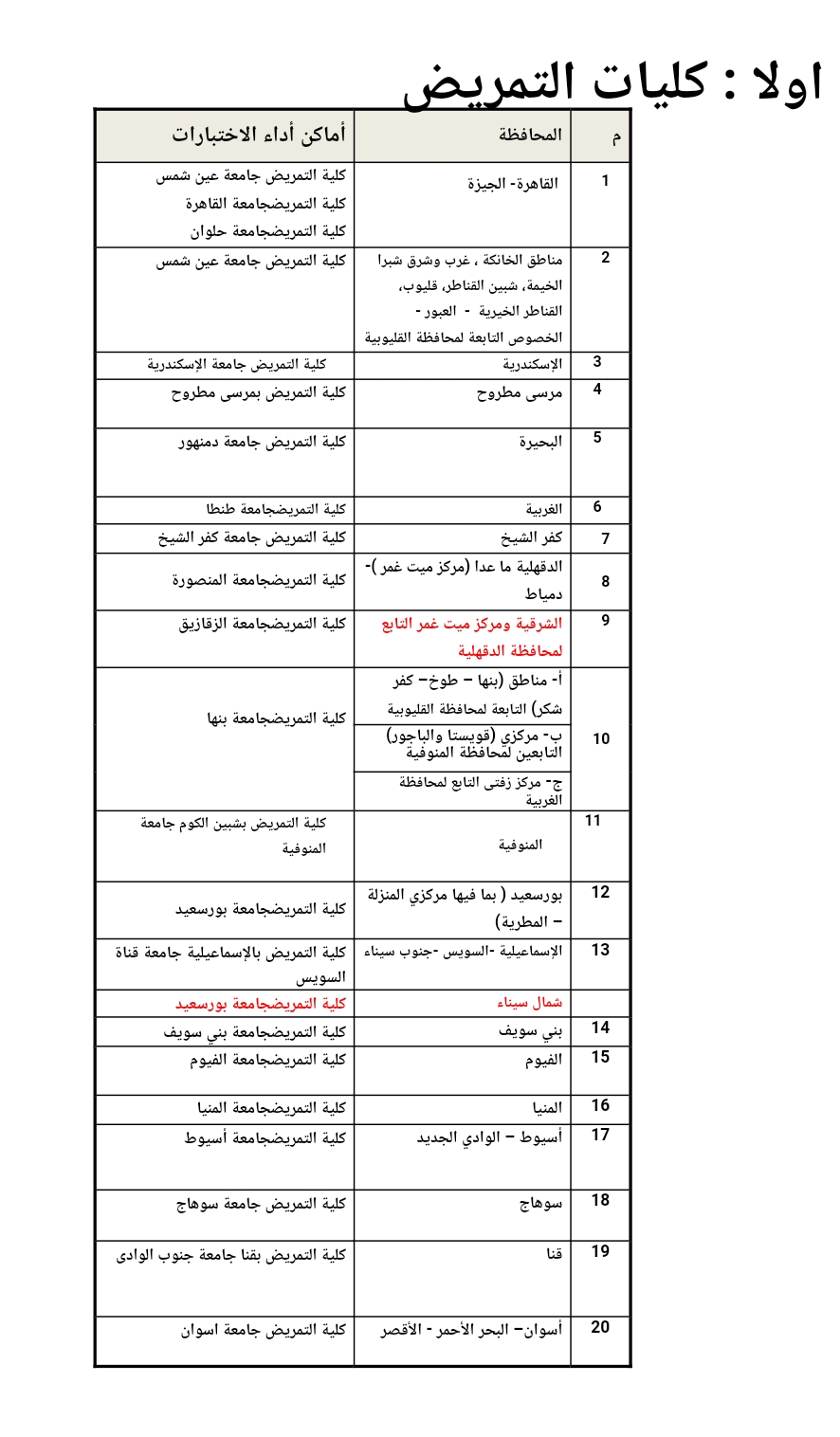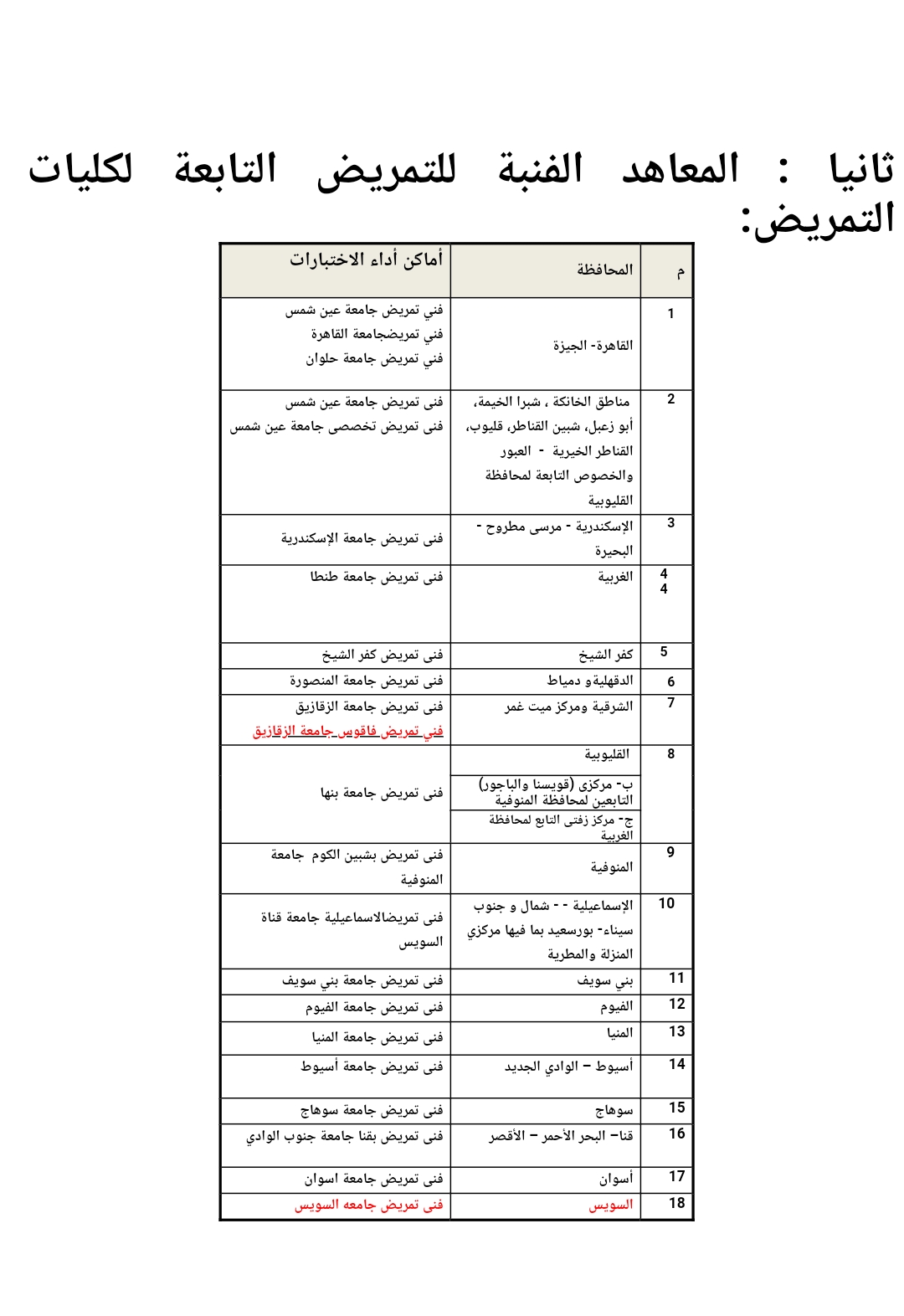 ويوضح الجدول الآتي أماكن أداء اختبارات القدرات بكليات التمريض والمعاهد التابعة لها:
