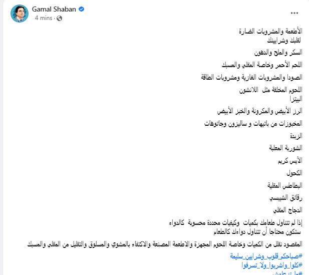 وكتب جمال شعبان تدوينة على الفيس بوك "الأطعمة والمشروبات الضارة لقلبك وشرايينك.. السكر والملح والدهون.. اللحم الأحمر وخاصة المقلي والمسبك.. الصودا والمشروبات الغازية ومشروبات الطاقة".