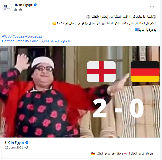 ونشرت الصفحة الرسمية للسفارة “كوميك بصورة الفنان الراحل علاء ولي الدين” من فيلم الناظر، وعلقت عليه قائلة: " النهاردة نهائي كورة القدم النسائية بين إنجلترا وألمانيا.. نتمنى كل الحظ للفريقين ونحب نفكر المانيا بس بالي حصل مع فريق الرجال في ٢٠٢١.. جاهزة يا ألمانيا!!!!"، في إشارة لهزيمة المنتخب الألماني للرجال على يد المنتخب الإنجليزي في اليورو الأخيرة.