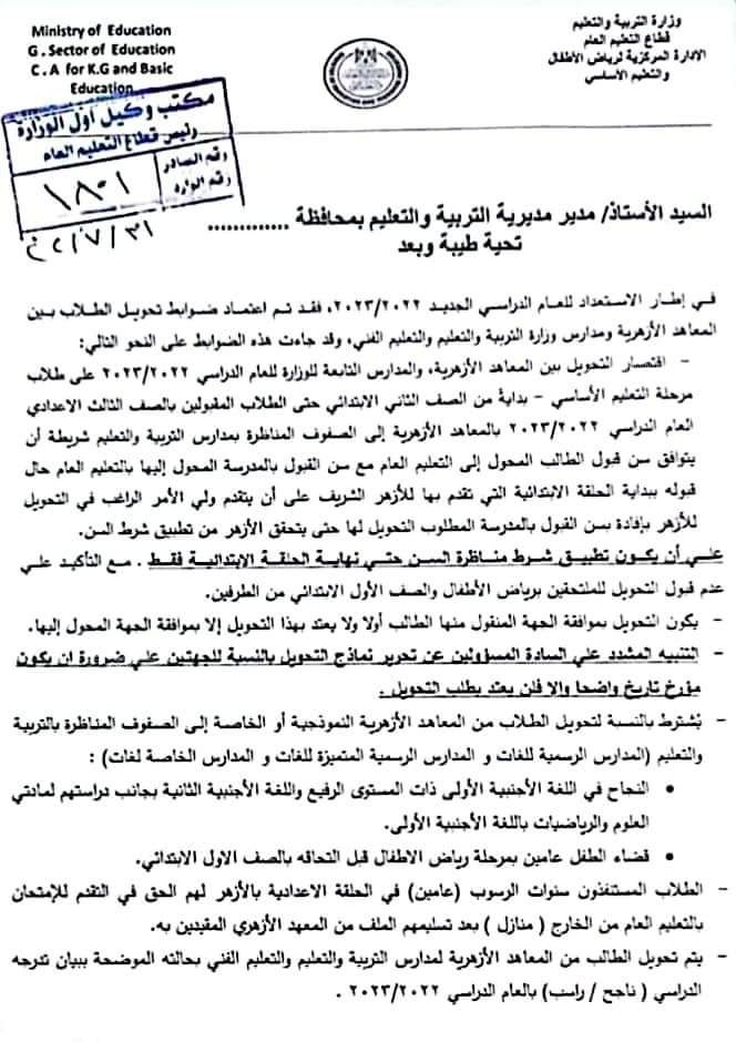 وأوضحت الوزارة، إنه تم اقتصار التحويل بين المعاهد الأزهرية والمدارس التابعة للوزارة على طلاب مرحلة التعليم الأساسي (من الصف الثاني الابتدائي حتى الطلاب المقبولين بالصف الثالث الإعدادي) بالمعاهد الأزهرية إلى الصفوف المناظرة بمدارس التربية والتعليم شريطة أن يتوافق سن قبول الطالب المحول إلى التعليم العام مع سن القبول بالمدرسة المحول إليها بالتعليم العام حال قبوله ببداية الحلقة الابتدائية التي تقدم بها للأزهر الشريف.