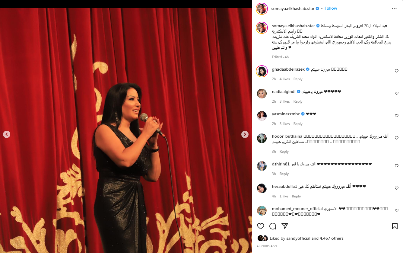 و تابعت:"كل الشكر والتقدير لمحافظ الإسكندرية اللواء محمد الشريف علي تكريمي بدرع المحافظة وكل الحب لاهلي وجمهوري اللي استقبلوني وفرحوا بيا من قلبهم كل سنة وأنتم طيبين".