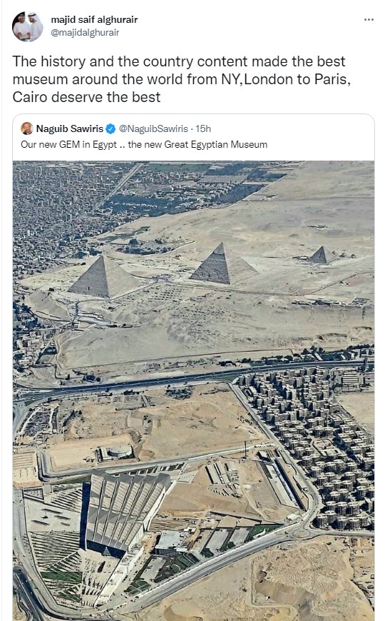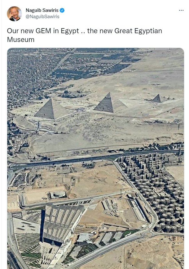 وعن المتحف المصري الكبير كتب نجيب ساويرس تغريدة عبر تويتر قال فيها: "متحفنا الجديد في مصر.. المتحف المصري الكبير الجديد".