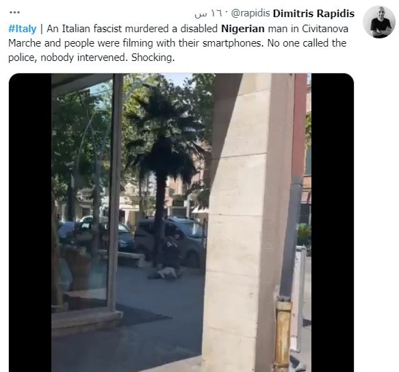 وقال نائب سكرتير جمعية تمثل النيجيريين في إيطاليا باتريك جوباديا: ”دعونا ندين الحقيقة نفسها وسلوك الأشخاص الذين وقفوا متفرجين وشاهدوا شخصا معوقا يُقتل بعكازة وصوروه“، بدلا من التدخل. وأضاف: ”إنه أمر مخز“.