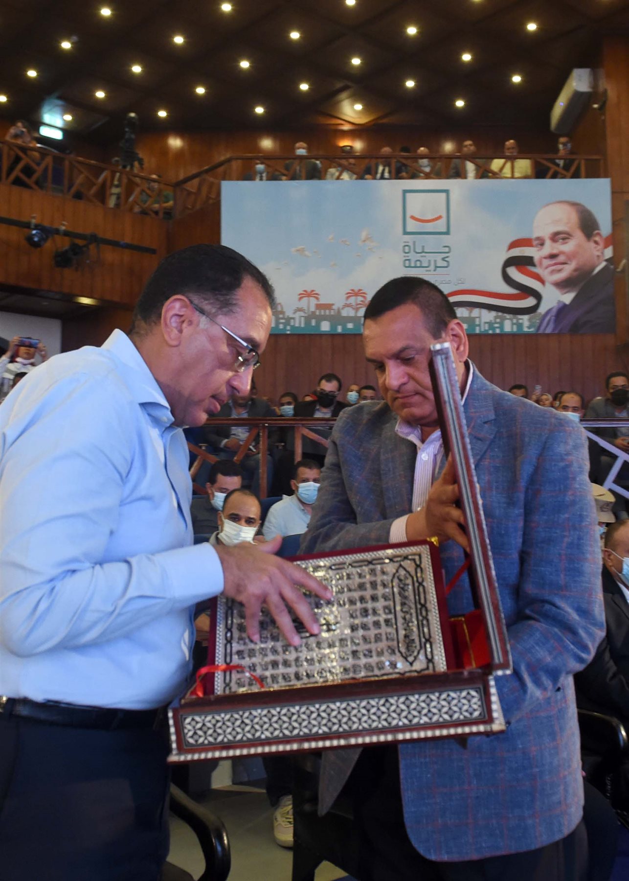 وعقب انتهاء العرض قام اللواء هشام آمنة، محافظ البحيرة، بإهداء نسخة من المصحف الشريف، ودرع المحافظة، إلى الدكتور مصطفى مدبولي، رئيس مجلس الوزراء، معرباً عن تقديره لهذه الزيارة، ومؤكداً أنها تسهم في دفع العمل بمختلف المشروعات الجاري تنفيذها بالمحافظة، وخاصة مشروعات "حياة كريمة".