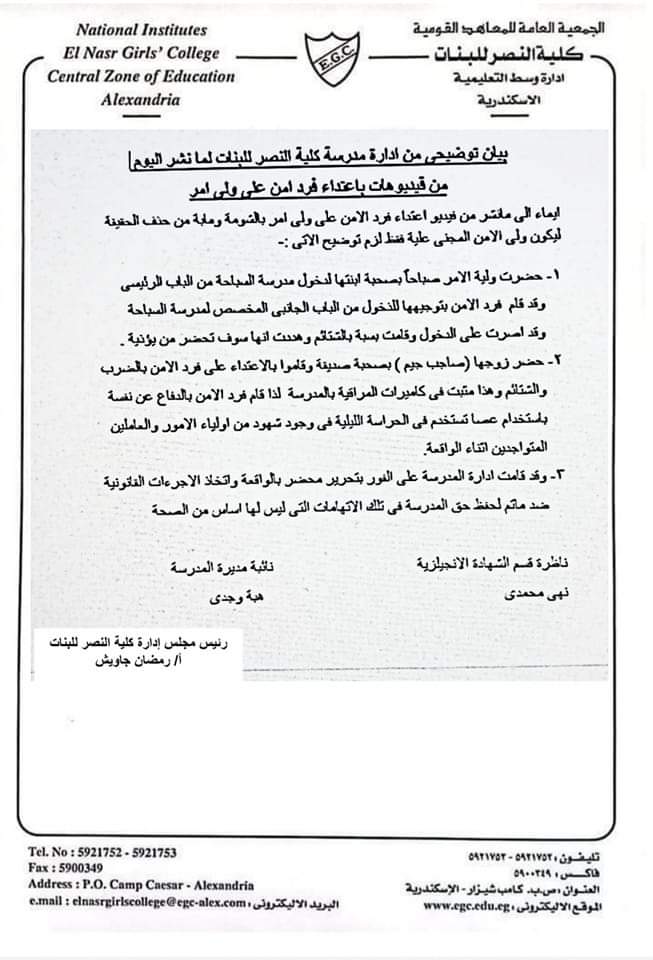 وشهدت مدرسة كلية النصر بنات E.G.C بالإسكندرية، التابعة للمعاهد والمدارس القومية وقائع اعتداء متبادل بين ولي أمر وصديقه وأمن المدرسة عقب اعتراض الأمن على محاولة دخول زوجته من الباب الرئيسي للمدرسة بصحبة ابنتها لتدريبات السباحة على عكس المتبع، لتستعين الزوجة بزوجها الذي حضر بصحبة صديقه ونشبت مشاجرة عنيفة بين الطرفين.