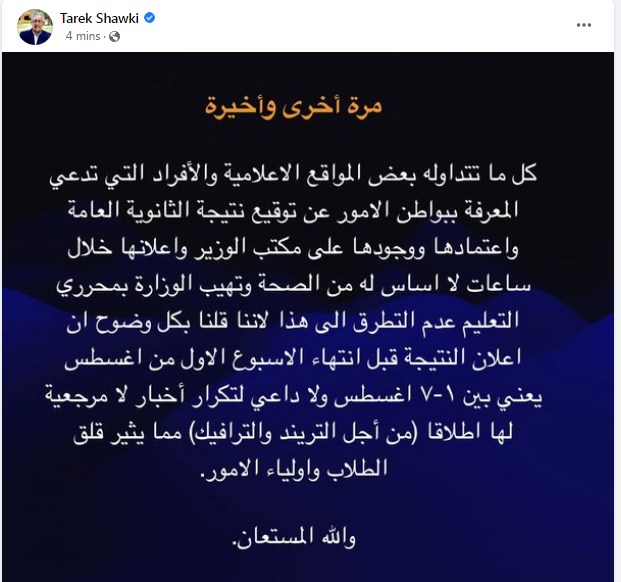 وكتب الدكتور طارق شوقي تدوينة على الفيس بوك "مرة أخرى وأخيرة: كا ما تتداوله بعض المواقع الإعلامية والأفراد التي تدعي المعرفة ببواطن الأمور عن توقيع نتيجة الثانوية العامة واعتمادها ووجودها على مكتب الوزير وإعلانها خلال ساعات لا أساس لها من الصحة"