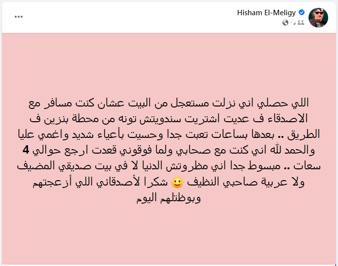 وقال "المليجي": "اللي حصلي إني نزلت مستعجل من البيت عشان كنت مسافر مع الأصدقاء فعديت اشتريت سندويتش تونه من محطة بنزين ف الطريق.. بعدها بساعات تعبت جدا وحسيت بأعياء شديد واغمي عليا والحمد لله اني كنت مع صحابي ولما فوقوني قعدت ارجع حوالي 4 ساعات.. مبسوط جدا اني مظروتش الدنيا لا في بيت صديقي المضيف ولا عربية صاحبي النظيف 🙂 شكرا لأصدقائي اللي أزعجتهم وبوظتلهم اليوم.