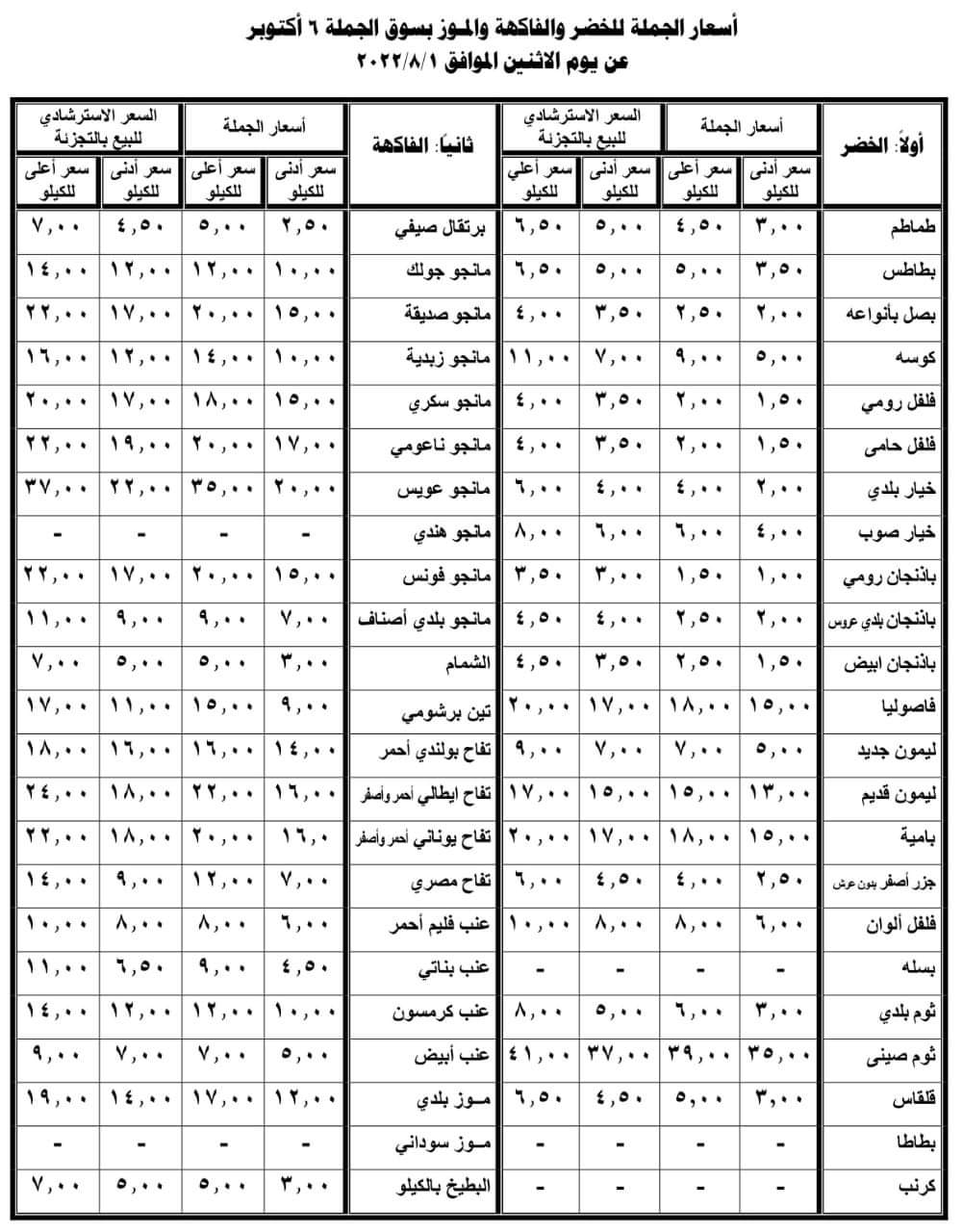 نشرت الصفحة الرسمية لمحافظة الجيزة على موقع التواصل الاجتماعي فيسبوك أسعار الخضراوات والفاكهة اليوم الاثنين في سوق أكتوبر لتجارة الجملة والمستمرة غدا الثلاثاء وفقا لآخر التطورات والمستجدات اليومية في الأسعار، حيث يعد سوق أكتوبر من أكبر الأسواق بمحافظة الجيزة في تجارة الجملة وتتوافر به كافة السلع.