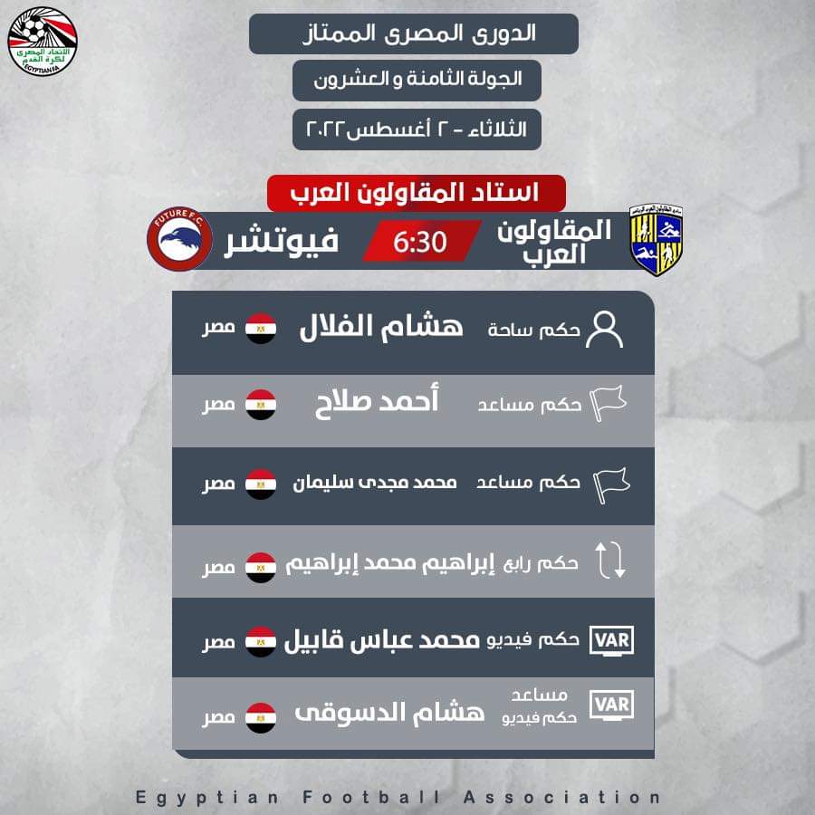 ويدير لقاء المقاولون العرب وفيوتشر حكم الساحة هشام الفلال، حكم مساعد أحمد صلاح، حكم مساعد محمد مجدي سليمان، حكم رابع إبراهيم محمد إبراهيم، حكم فيديو محمد عباس قابيل، مساعد حكم فيديو هشام الدسوقي.