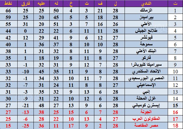 وينشر فيتو جدول ترتيب الدوري الممتاز بعد فوز الزمالك على بيراميدز 3-0 في الجولة الـ28 لمسابقة الدوري.