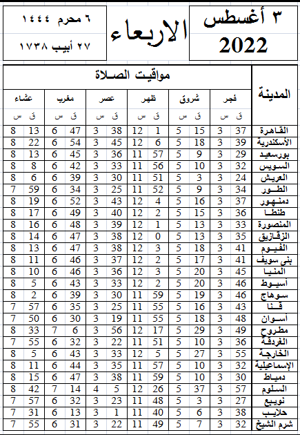 مواقيت الصلاة اليوم وفقًا للتوقيت المحلي لمدينتي القاهرة والإسكندرية وعدد من مدن ومحافظات الجمهورية من واقع بيانات الهيئة العامة للمساحة: