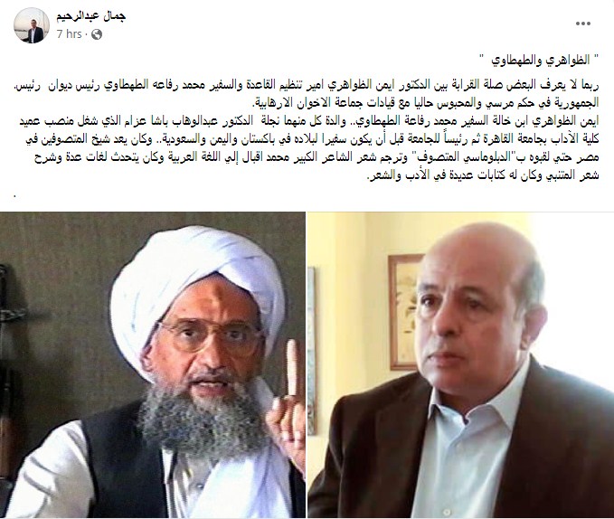 كما أوضح جمال عبد الرحيم العلاقة بين زعيم تنظيم القاعدة أيمن الظواهري والسفير محمد رفاعة الطهطاوي رئيس ديوان رئيس الجمهورية في حكم الرئيس محمد مرسي.
