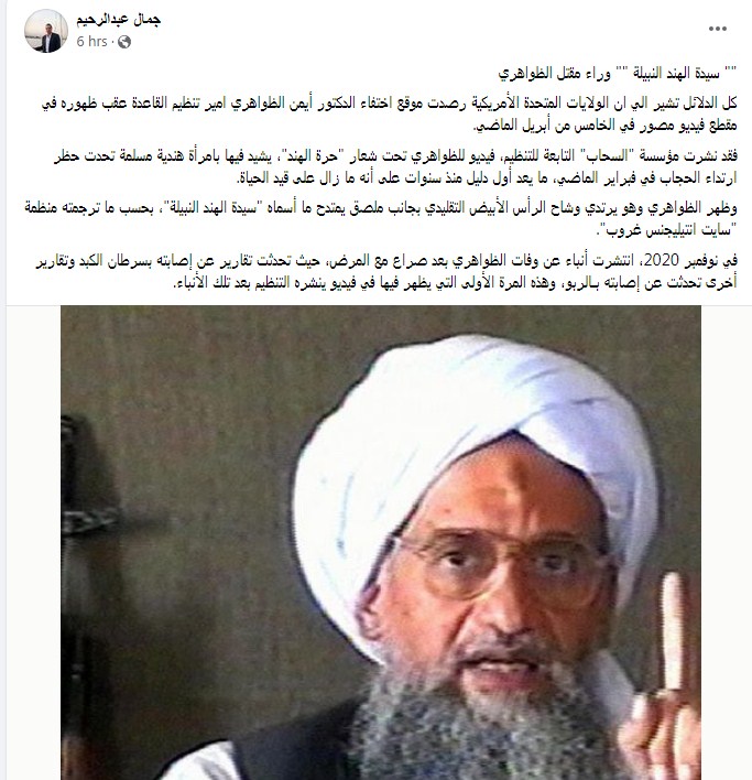وأضاف جمال عبد الرحيم "نشرت مؤسسة "السحاب" التابعة للتنظيم، فيديو للظواهري تحت شعار "حرة الهند"، يشيد فيها بامرأة هندية مسلمة تحدت حظر ارتداء الحجاب في فبراير الماضي، ما يعد أول دليل منذ سنوات على أنه ما زال على قيد الحياة".