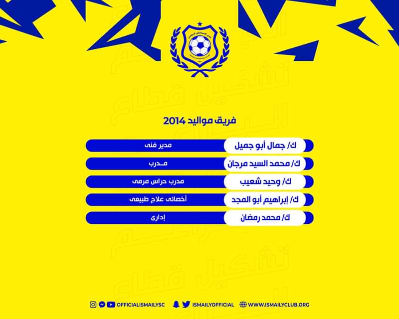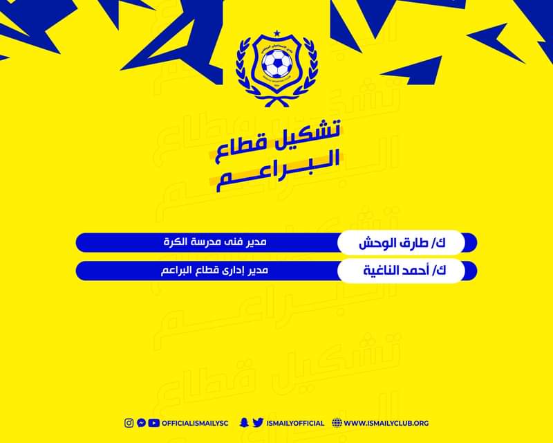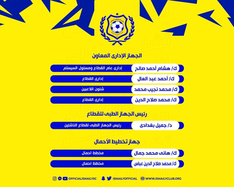أعتمد مجلس إدارة نادي الاسماعيلي تشكيل الأجهزة الفنية والإدارية لقطاع الناشئين لكرة القدم موسم 2022-2023.