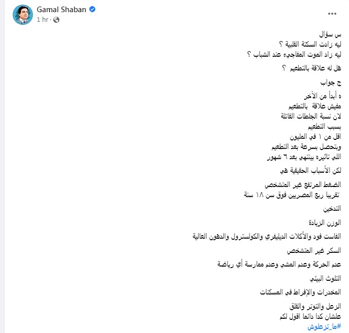 وعن الأسباب الحقيقية وراء الموت المفاجئ للشباب قال جمال شعبان: "لكن الأسباب الحقيقية هي الضغط المرتفع غير المتشخص تقريبا ربع المصريين فوق سن ١٨ سنة، التدخين والوزن الزيادة الفاست فود والأكلات الديليفري والكولسترول والدهون العالية، السكر غير المتشخص عدم الحركة وعدم المشي وعدم ممارسة أي رياضة التلوث البيئي المخدرات والإفراط في المسكنات الزعل والتوتر والقلق علشان كدا دائما اقول لكم #ما_تزعلوش".