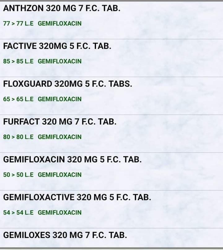 كانت اللجنة الفنية للرقابة علي للأدوية بهيئة الدواء المصرية وقف تسجيل جميع المستحضرات لمستحضر جيميفلوكساسين Gemifloxacin مضاد حيوي وإلغاء إنتاج جميع المستحضرات التي تحتوي علي تلك المادة وإعطاء مهلة ٣ شهور للشركات لتوفيق أوضاعها وسحب جميع المستحضرات من السوق جيميفلوكساسين Gemifloxacin