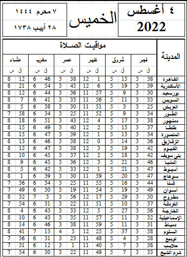 مواقيت الصلاة اليوم وفقًا للتوقيت المحلي لمدينتي القاهرة والإسكندرية وعدد من مدن ومحافظات الجمهورية من واقع بيانات الهيئة العامة للمساحة: