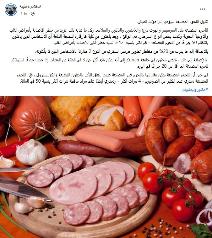 وكتب الدكتور وليد شوقي تدوينة عبر الفيس بوك " تناول اللحوم المصنعة سيؤدي إلى موتك المبكر. اللحوم المصنعه مثل السوسيس والهوت دوج واللانشون والباكون والسلامى وكل ما شابه ذلك تزيد من خطر الإصابة بأمراض القلب والأوعية الدموية وكذلك بعض أنواع السرطان".